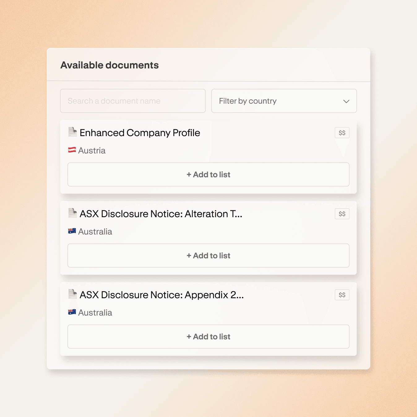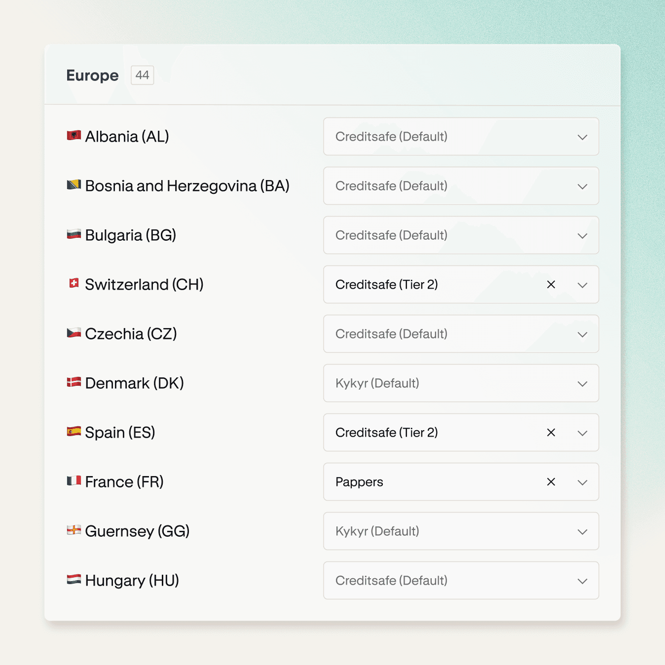 Access official government registries for regulatory filings, premium providers for enhanced due diligence, and local credit bureaus for financial risk assessment. All through one API.