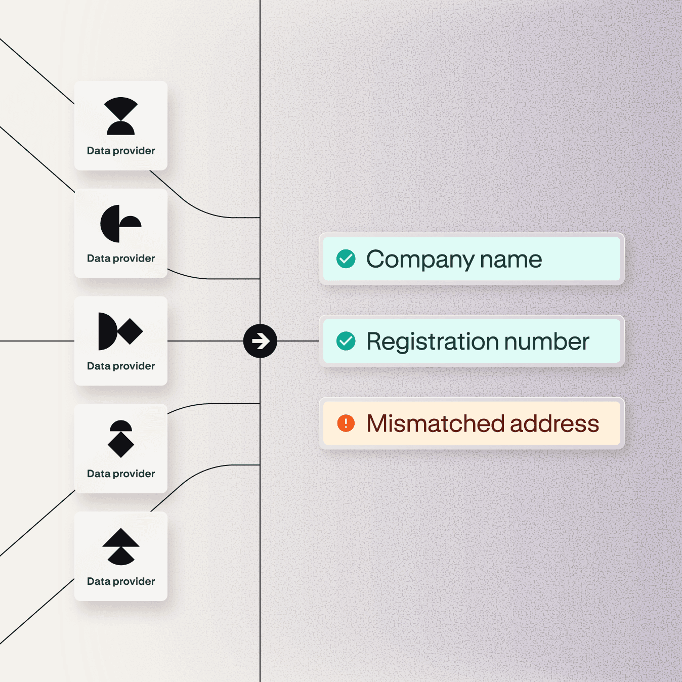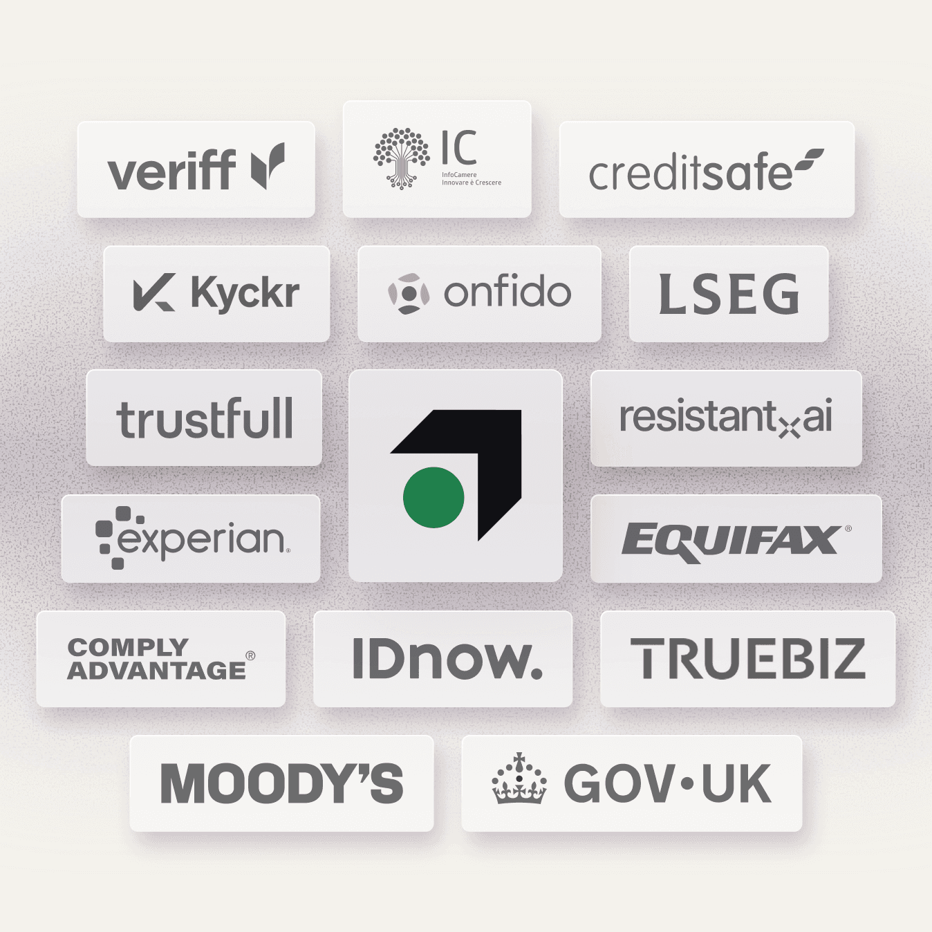 Access business registries, credit bureaus, identity providers, and AML screening through a single API.