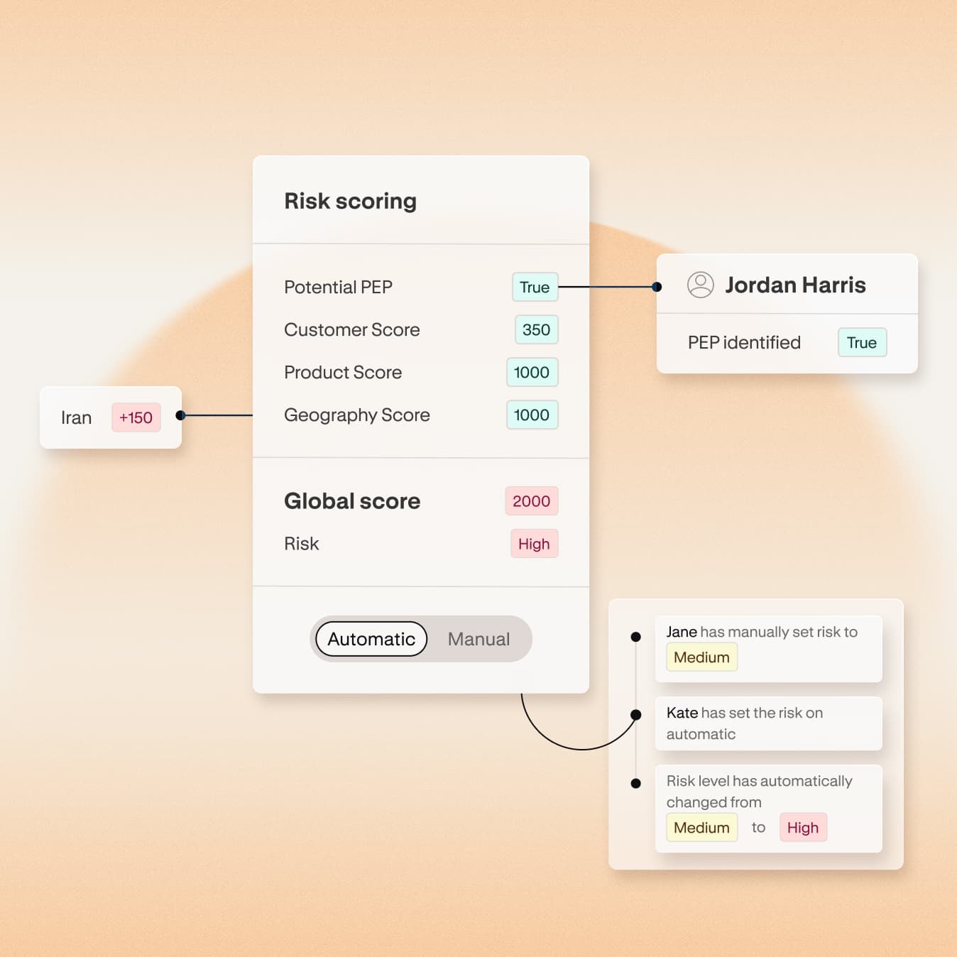 Every data change recalculates risk instantly. New PEP hit? Score adjusts. Ownership clarified? Risk drops.