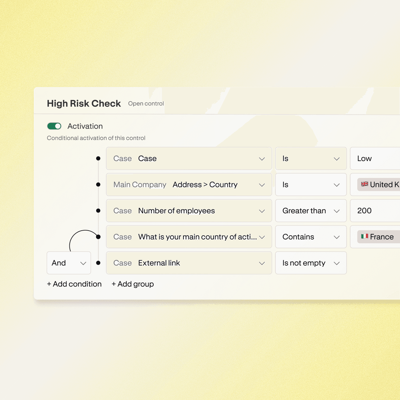 Define risk factors, assign weights, and set thresholds that match your risk appetite and regulatory requirements.