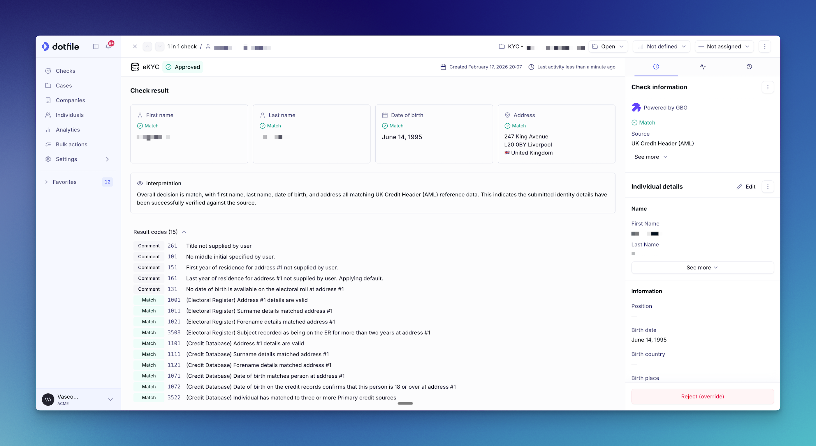 Dotfile sends the individual's information to GBG, who validates it against national databases — government registries, credit bureaus, and other authoritative sources. Each field (name, date of birth, address, national identifier) is assessed individually and returns a match status. Our default configuration uses 2-source matching, meaning identity must be confirmed against at least two independent data sources before an approval is returned. When sources disagree, you can see exactly which one flagged the discrepancy.