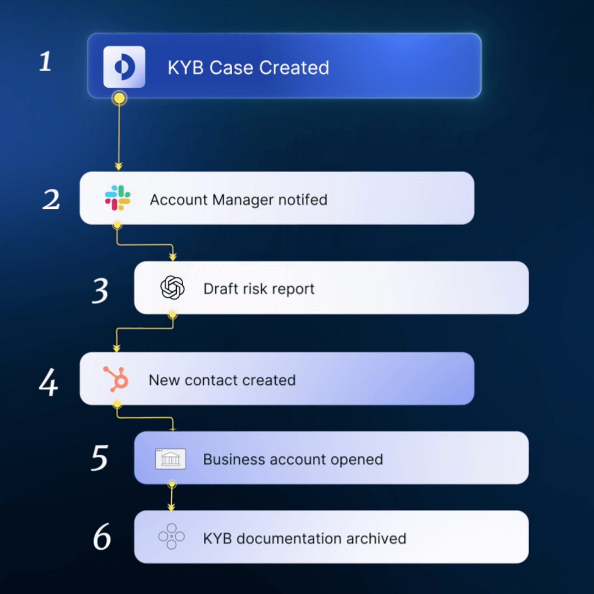 Create simple "if this, then that" workflows that handle complex KYB processes automatically across Dotfile and your connected apps.